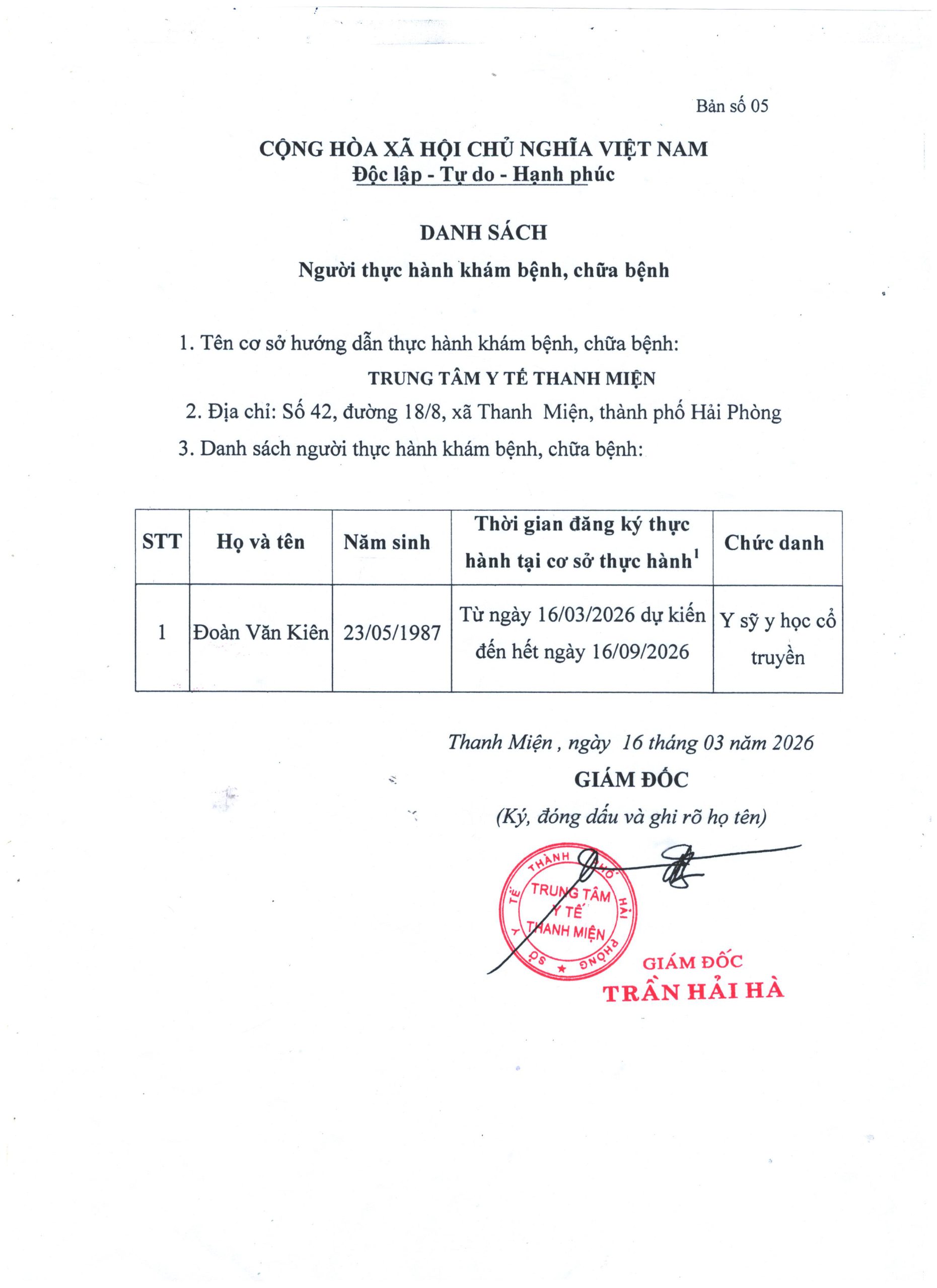 17/03/2026 63 Lượt xem DANH SÁCH NGƯỜI THỰC HÀNH KHÁM BỆNH CHỮA BỆNH 16/03/2026 Tweet Bài viết trước đó THƯ MỜI CHÀO GIÁ CUNG CẤP THAN BÙN Bài viết sau đó Một số hình ảnh nhân viên TTYT Thanh Miện hưởng ứng tháng cao điểm cài đặt sổ SKĐT cho bệnh nhân, người nhà bệnh nhân Bài viết liên quanDANH SÁCH NGƯỜI HOÀN THÀNH THỰC HÀNH 06/04/2026DANH SÁCH NGƯỜI THỰC HÀNH KHÁM BỆNH, CHỮA BỆNH 24/03/2026DANH SÁCH NGƯỜI THỰC HÀNH KHÁM BỆNH CHỮA BỆNH 24/03/2026DANH SÁCH NGƯỜI THỰC HÀNH KHÁM BỆNH, CHỮA BỆNH 18/03/2026DANH SÁCH NGƯỜI HOÀN THÀNH THỰC HÀNH 09/03/2026Danh sách người hoàn thành thực hành 03/03/2026DANH SÁCH NGƯỜI ĐĂNG KÍ THỰC HÀNH KHÁM BỆNH, CHỮA BỆNH 29/01/2026DANH SÁCH HOÀN THÀNH THỰC HÀNH 13/01/2026DANH SÁCH NGƯỜI HOÀN THÀNH THỰC HÀNHDS ĐĂNG KÝ THỰC HÀNH KBCB 31.12.2025